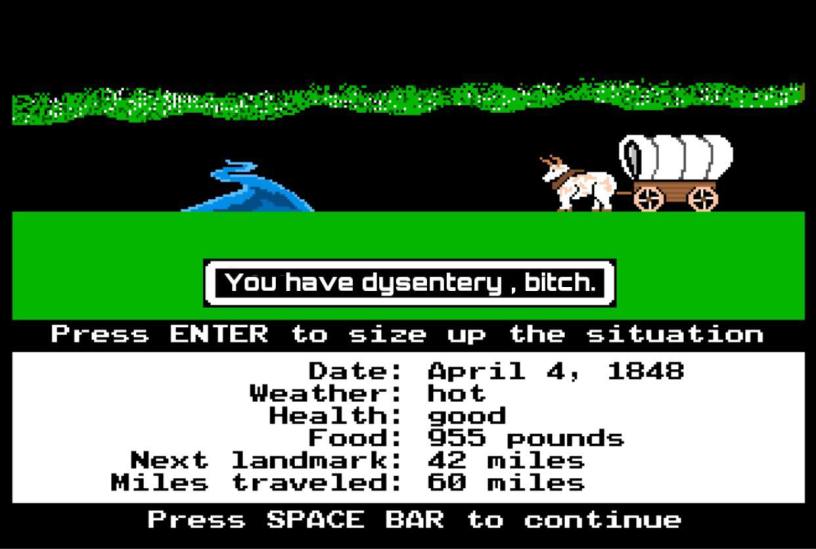 Everyone remembers sitting in their third-grade classroom playing some iteration of this classic computer game. Nowadays there are parodies like The Organ Trail where your task is to kill zombies. This is a metaphor for how dead we all are inside – playing The Oregon Trail won’t mask that pain. Also, you’ll probably get dysentery.