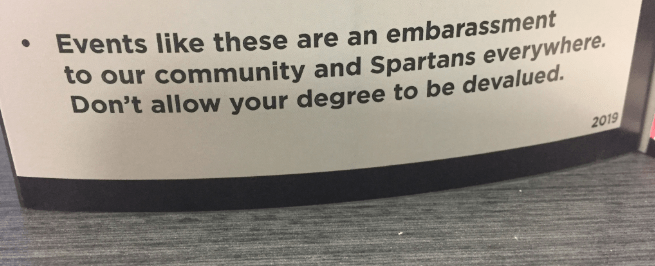 Michigan State distributed flyers to all major cafeterias asking that the student body not partake in this rowdy behavior because “events like these are an embarrassment to our community.” Missing the irony all together, MSU seems to have forgotten the many ways it embarrassed itself over the past few years.