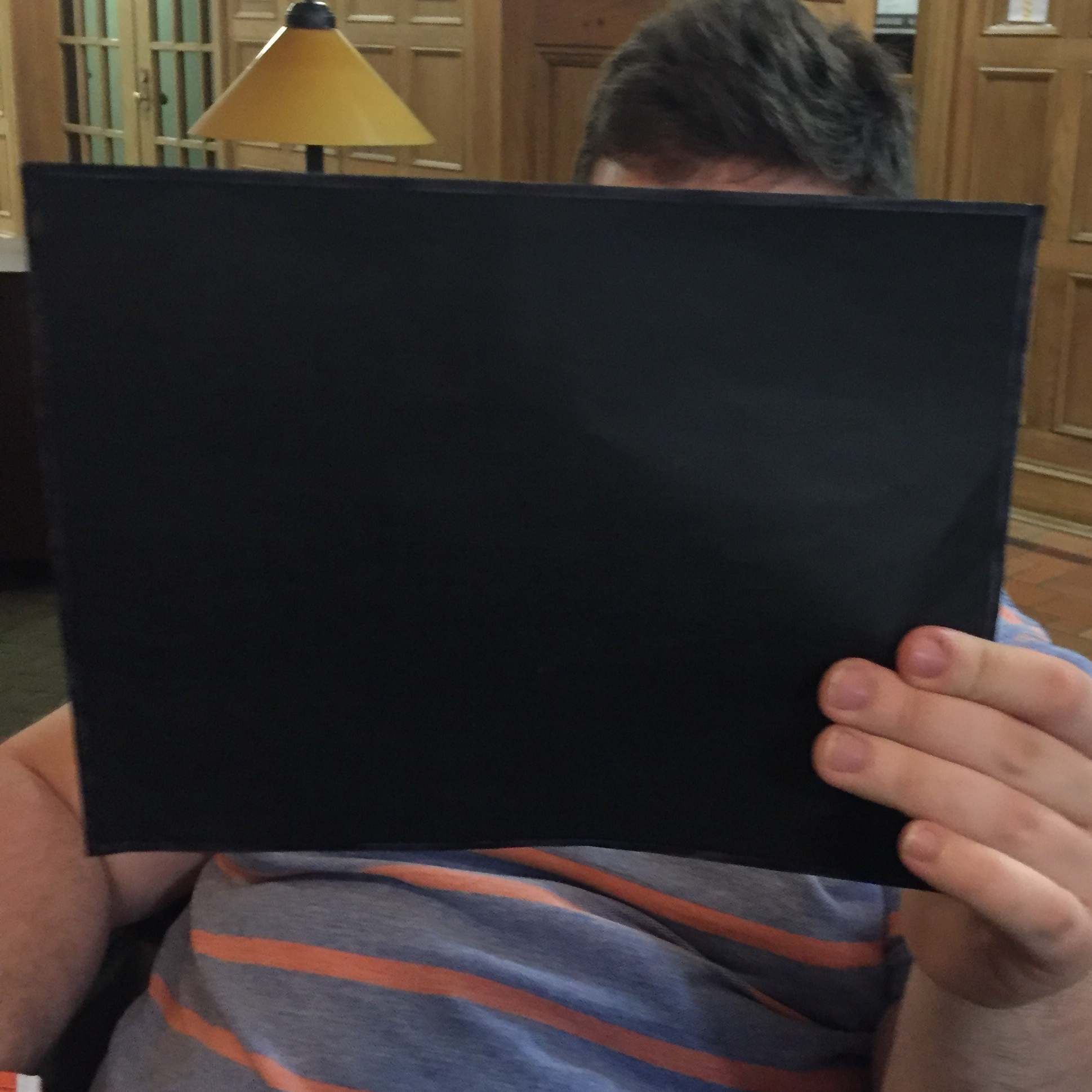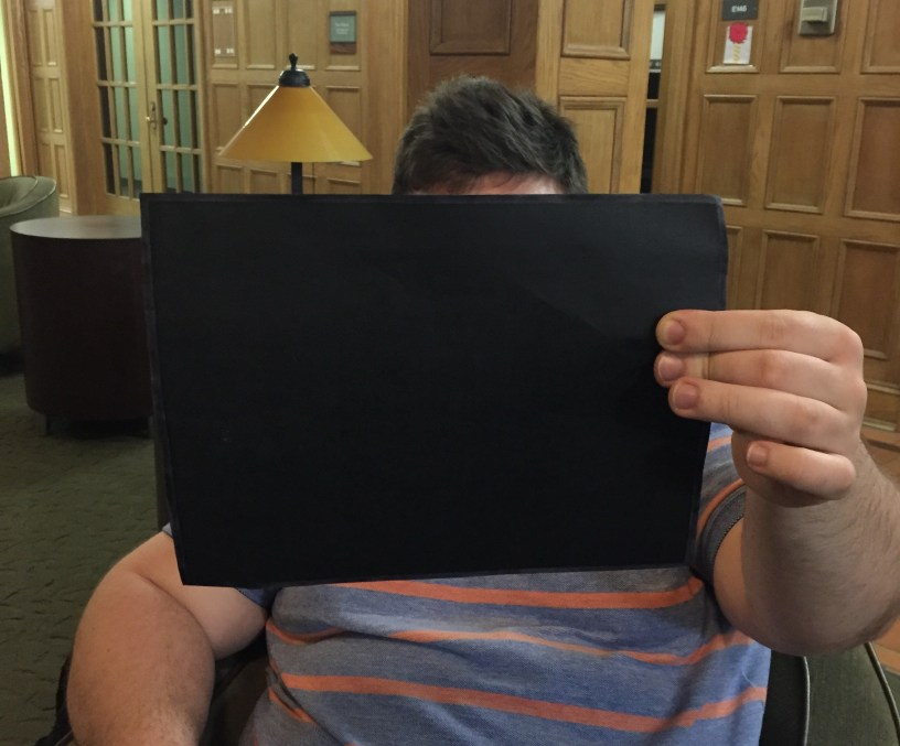 No officers came to get me. There have been no legal consequences, only moral consequences. Patrons in the Snyder Hall lounge where I created this monstrosity recoiled at the sight of it. It gives you an uneasy feeling just to hold in your hands. It wasn’t like any black paper you could buy in the store, this was different. It lacked the soul, it knew what it was supposed to be, and this wasn’t it.